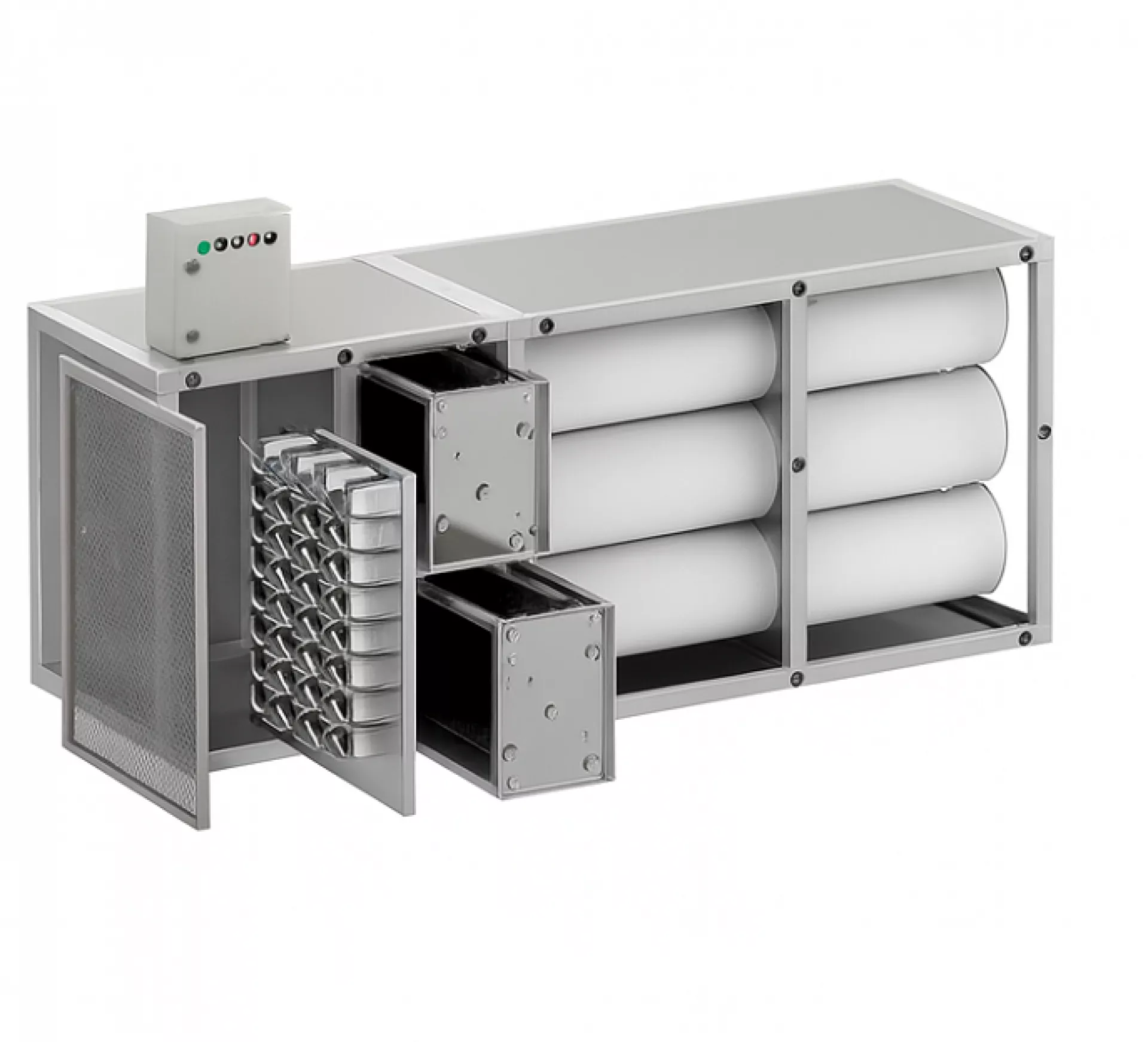 Приточно-вытяжное оборудование для ресторанов чаще всего подвесного исполнения. Приточная установка занимает по высоте от 550 до 600мм. Дина оборудования от 1.6 до 2.2 метра. А ширина – около 1 метра. Дополнительно от 600 до 1000мм занимает шумоглушитель для снижения уровня шума от вентиляторов.