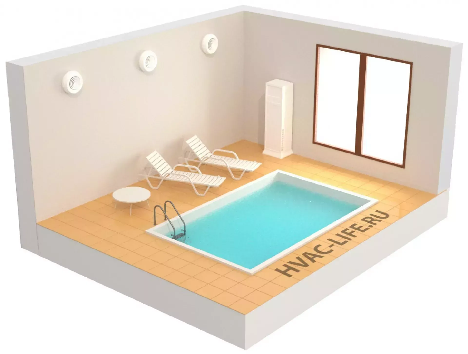 Удаление влажности в бассейне с помощью настенного или канального осушителя. Поступление свежего воздуха из приточных клапанов стене.